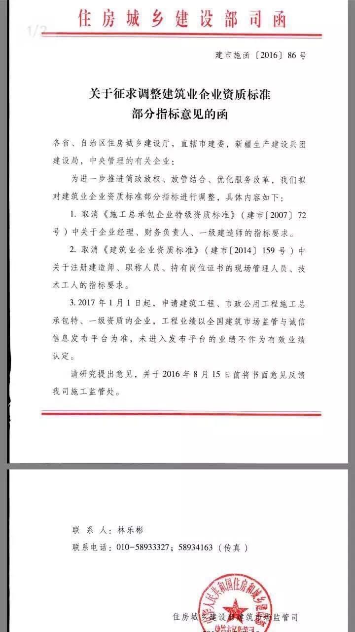 首先肯定一點(diǎn)的是《關(guān)于征求調(diào)整建筑業(yè)企業(yè)資質(zhì)標(biāo)準(zhǔn)部分指標(biāo)意見(jiàn)的函》是真的,住建部網(wǎng)站首頁(yè),詳見(jiàn)政策發(fā)布欄 2016.86文件;